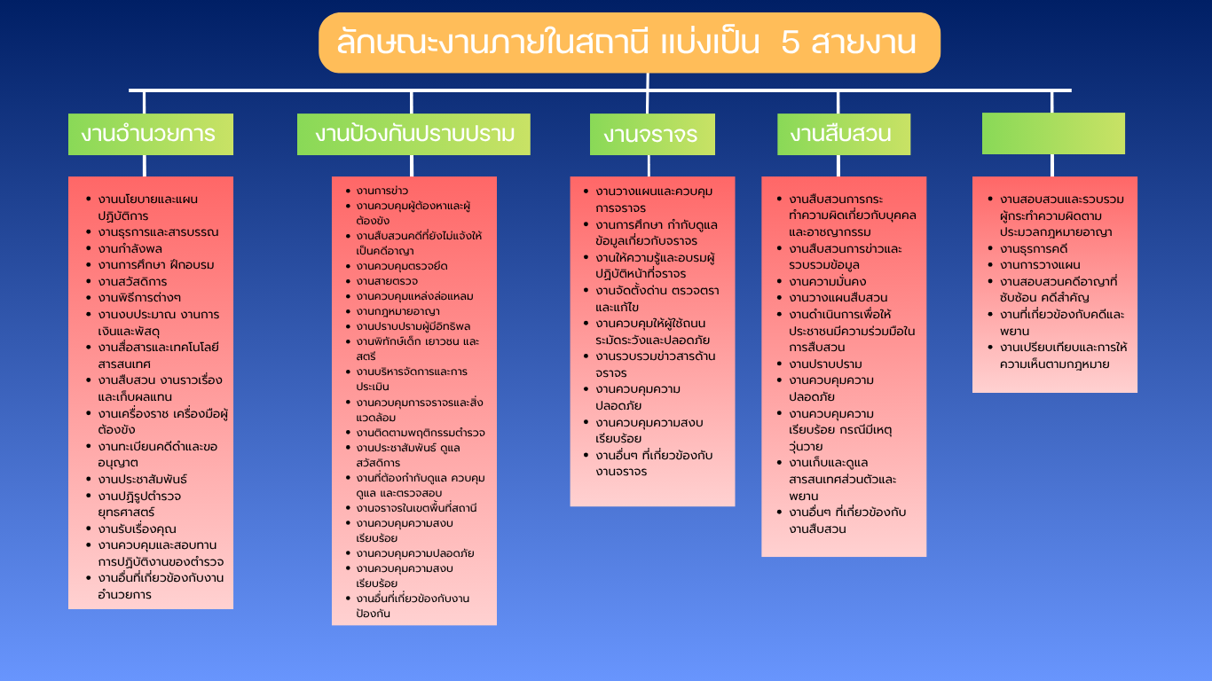 1). รองผู้กำกับการป้องกันปราบปราม เป็นหัวหน้างานอำนวยการ งานป้องกัน ปราบปราม และงานจราจร